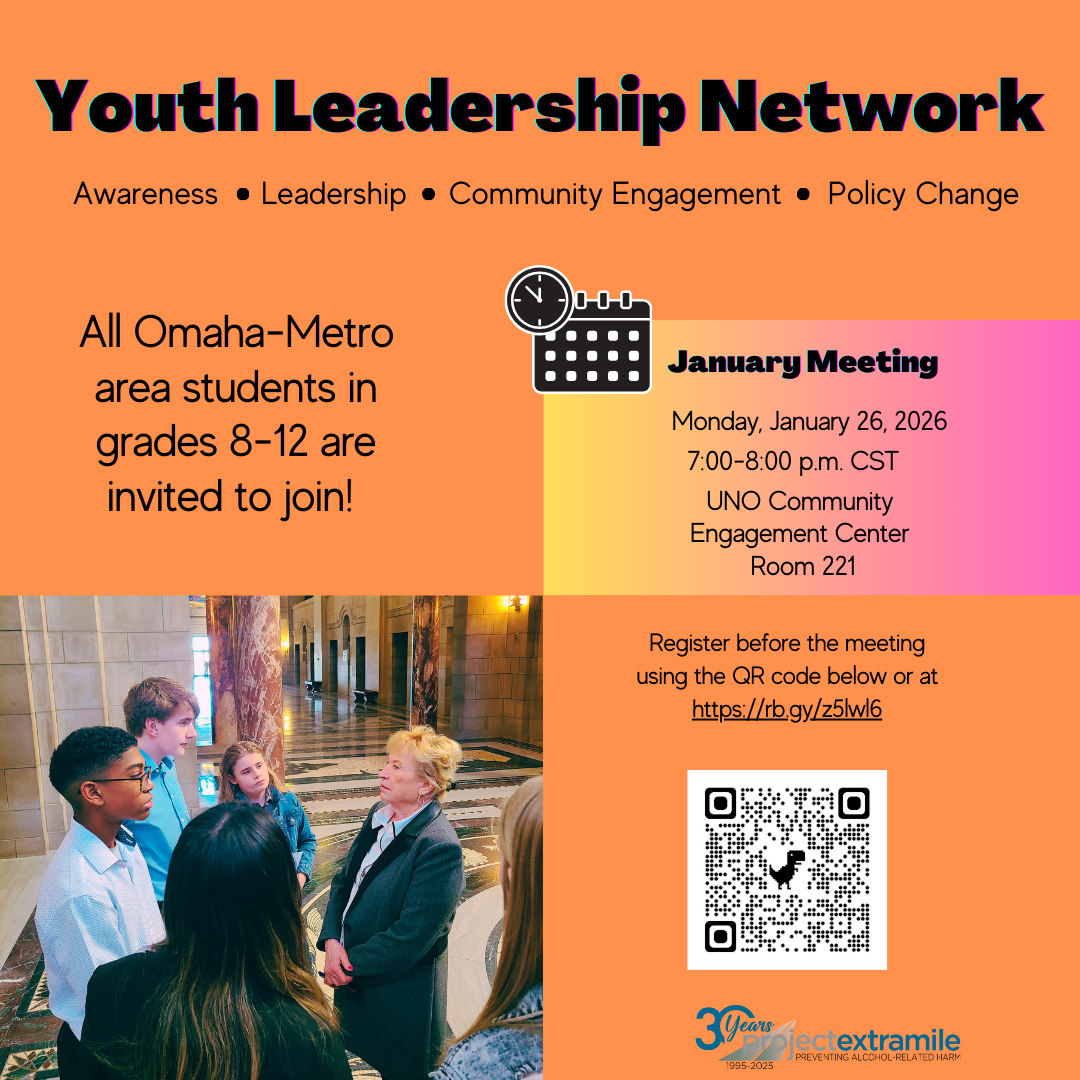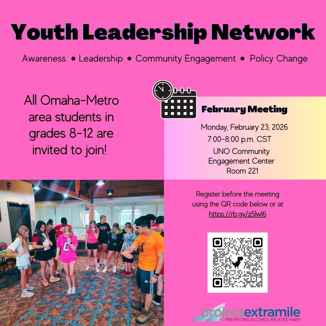 Youth in grades 8-12 in the Omaha-Metro area are welcome to join Youth Leadership Network (YLN). Members will learn about the harms of excessive alcohol use in our community, develop the leadership skills needed to make real change, and put those skills into action! In YLN, we place a unique focus on practicing valuable leadership skills. Members will receive expert guidance on projects that utilize media literacy, public speaking, advocacy, problem-solving, and collaboration. We're serious about youth leadership, which is why all projects are planned and developed by youth themselves. Youth projects over the last year have included hosting a town hall, meeting with state senators, and creating media campaigns to raise awareness. No prior experience is necessary to join as our staff will work with all youth to develop their skills. The program is free and held once a month at the Barbara Weitz Community Engagement Center on the University of Nebraska- Omaha Dodge Campus.